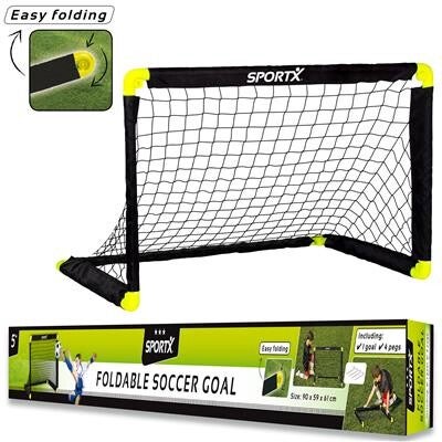 SportX voetbaldoel, met een superhandig vouwsysteem. Op de hoekpunten van deze goal zit namelijk een scharnier. De goal wordt volledig gemonteerd geleverd: simpelweg uitklappen, zekeren in de grond met de 4 bijgeleverde haringen, en je bent klaar voor een potje voetbal! Afmeting: 90 x 59 x 61 cm. Geschikt voor PVC ballen met een grootte van max 20 cm. Geschikt voor kinderen vanaf 5 jaar.