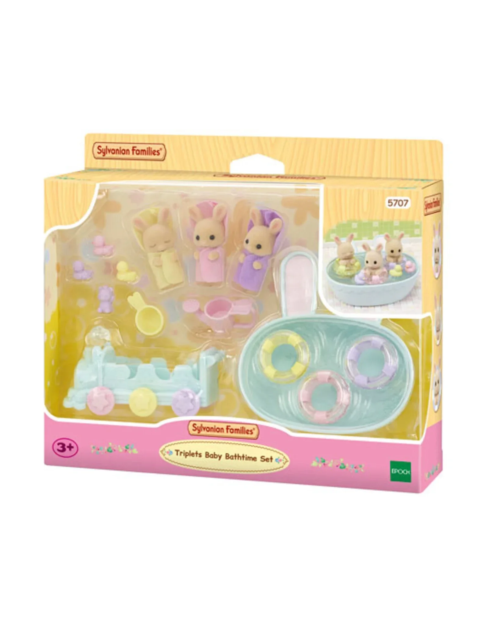 De set bestaat uit de drie pasgeboren konijnendrielingen, een babybadje met op kleur afgestemde bad eendjes plus een grote speelgoedtrein waar ze allemaal op kunnen spelen.