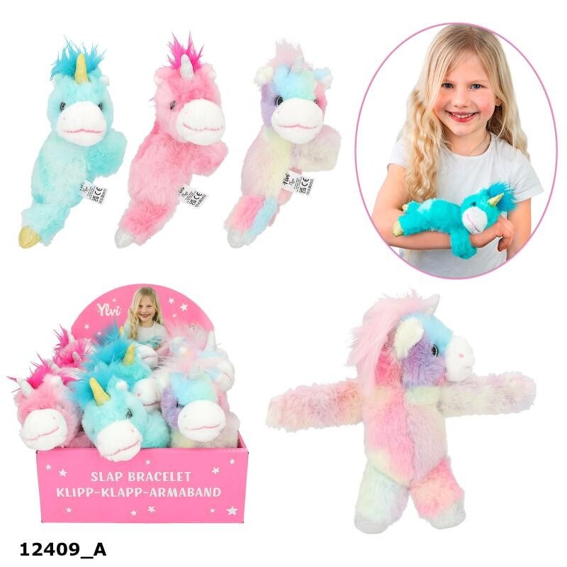 Zo schattig, zo zacht, zo klikeenvoudig om te doen: de klikarmband van Ylvi in de vorm van een eenhoorn met een glitter hoorn en hoeven is verkrijgbaar in drie kleuren: tuquoise, roze en vrolijke pasteltinten. Aanbevolen vanaf 18 maanden.