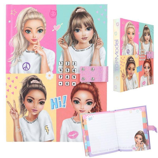 Coole foto's van de TOPModels: het dagboek met vier portretten van de TOPModels gaat alleen open als je de juiste 4-cijferige code invoert (persoonlijk in te stellen en te veranderen). Dan hoor je de hit Shivers voor ca. 20 seconden. Het dagboek heeft binnenin 80 fleurige pagina's met fijne lijntjes.