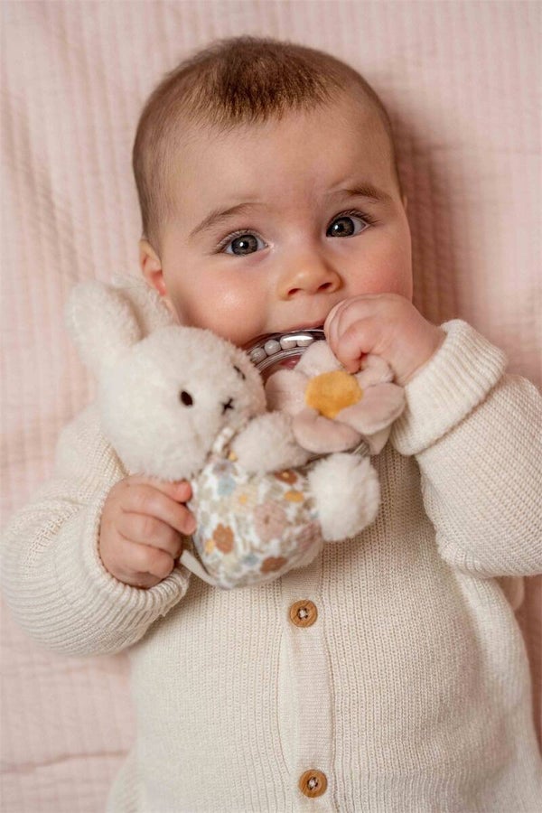 Grijp, schud en knuffel! Dit kleine zachte nijntje houdt een leuk speeltje vast dat schattige geluidjes maakt als je het beweegt en schudt. Gekleed in Vintage Little Flowers, een Little Dutch design, nodigt nijntje je uit om te spelen met de ringrammelaar en lekker te knuffelen met het roze bloemetje dat ze voor je heeft geplukt. De transparante ring is gevuld met kleine kraaltjes die rammelen als je baby’tje nijntje op en neer en heen en weer beweegt. Klassiek speelgoed, perfect voor in de box, dat de hand-oogcoördinatie verbetert en de zintuigen stimuleert.