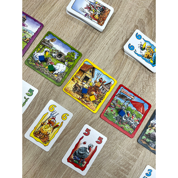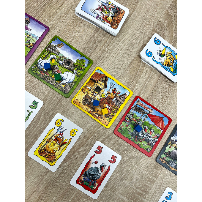 Vlot blufspel voor het hele gezin! Het pluimvee op de boerderij houdt een groot buffet. De vossen uit de omgeving eten ook graag mee, maar die hebben duidelijk een ander beeld van de samenstelling van het menu. Speel pluimveekaarten om graankorrels te verzamelen en vossenkaarten om juist pluimvee te verschalken. De locaties waar je de kaarten naartoe stuurt, bepalen wie er met de buit vandoor gaat.