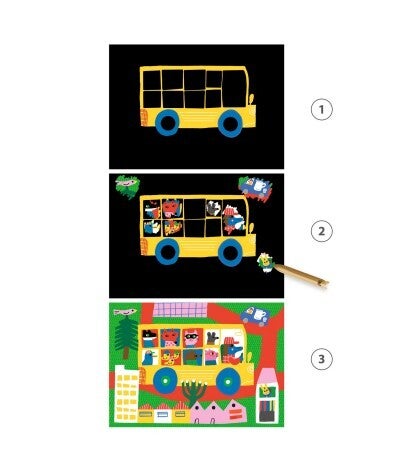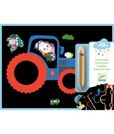 5 grote krasschilderijen met het thema voertuigen en een houten stokje dat geschikt is voor peuters vanaf 18 maanden. Met beide kanten van het stokje krast het kind over het oppervlak van de kaart om sporen te maken en verrassingen te ontdekken, wat een pret! En zelfs als het kind in zijn/haar enthousiasme alles wil bekrassen, is het resultaat ook mooi.