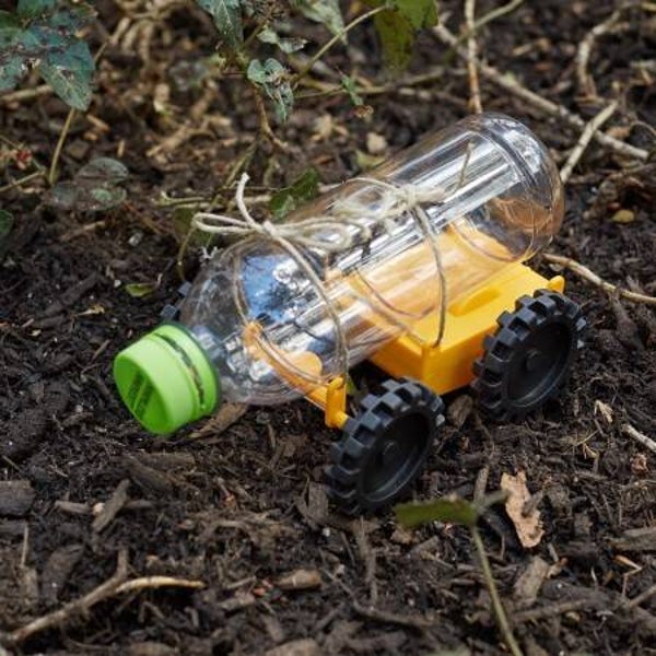 De set bevat twee basisonderdelen, touw en batterijen. Het is de bedoeling dat je een (plastic) fles aan de bovenkant vast maakt. De auto kan zelf rijden en wordt geleverd met batterijen (2 x AAA). Dit product is onderdeel van de Huckleberry collectie van Kikkerland, die kinderen stimuleert om meer buiten te zijn.