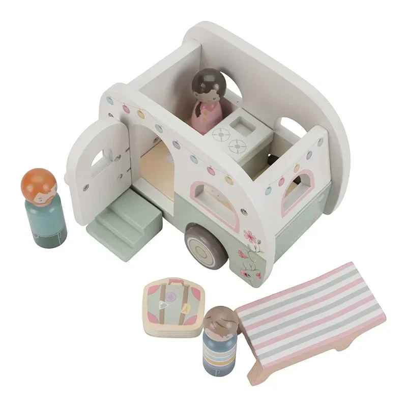 Laten we een droomreis maken en de weg op gaan! Ontdek de avontuurlijke wereld met de schattige roze auto met caravan en geniet van de vrijheid. Met de caravan maak je namelijk van elke plek een kampeerplek, waar je maar wilt. Of het nu de woonkamer, de speelkamer of de keuken is, haal de strandstoel tevoorschijn, pak de koffers uit en laat de 3 houten figuurtjes genieten van de omgeving. De soepel rollende wielen laten jouw kleintje moeiteloos over de vloer rijden op zoek naar een nieuwe plek om een nachtje te kamperen. De deur en het dak van de caravan kunnen open en de poppetjes passen ook bij het poppenhuis en de andere speelsets, zoals het vliegtuig en de schoolbus. Laat je kindje genieten van de magie van reizen met deze veelzijdige houten speelset.