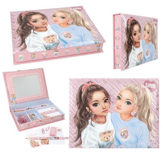 Alles voor op je bureautje: in de schrijfwarendoos van TOPModel zitten 3 vrolijke potloden met afbeeldingen van modellen, 1 gum met een schattige teddy print, 25 roze paperclips en 100 notitiebriefjes. De roze doos is versierd met vele teddy's, heeft een blokjesprint en elegante modellen. In de klapdeksel zit ook nog een spiegel.