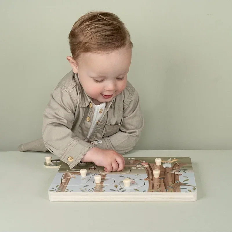 Maak kennis met alle wezentjes in het bos. Herken de vormen en unieke geluiden met deze leuke geluidenpuzzel. Als je een stukje optilt hoor je een bijpassend geluidje. Deze puzzel met 7 stukjes van dieren, blaadjes en paddenstoelen, bevordert de oog- hand coördinatie en stimuleert de woordenschat van je kindje. De sensoren reageren wanneer een puzzelstukje wordt teruggeplaatst. Puzzel bevat door licht geactiveerde sensoren - gebruik bij fel licht voor de beste resultaten. Zorg ervoor dat de schakelaar op AAN staat om de geluidsfunctie in te schakelen. Sensoren kunnen per ongeluk worden geactiveerd door direct zonlicht, dus schakel ze altijd uit als er niet mee wordt gespeeld. (Batterijen (2 x AAA) niet inbegrepen.