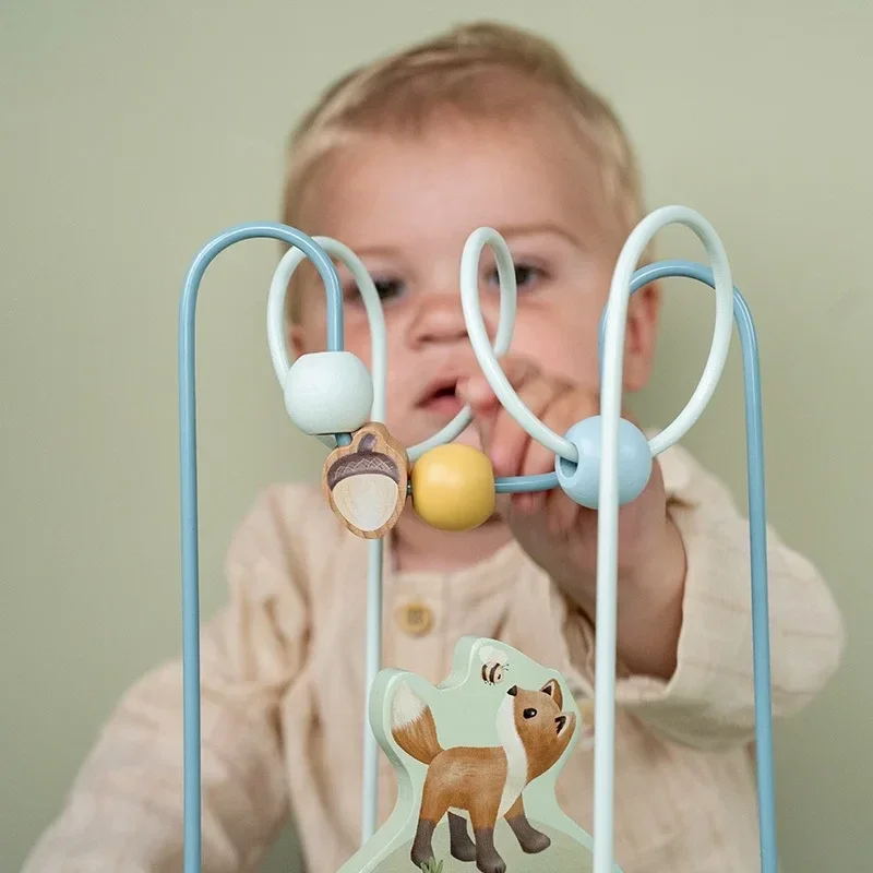 Breng de kralen van links naar rechts in de betoverende wereld van Forest Friends. Onderweg ontmoet je de vriendelijke vos, de egel, het kevertje en de kleine slak, die leven en spelen in het bos. Schuif ze heen en weer om de smakelijke eikels, weelderige bladeren en dennenappels te ontdekken die verscholen liggen tussen de wortels van de bomen. Gebruik je verbeelding en laat het avontuur beginnen! Deze houten activiteitenspiraal biedt een leerzame en betoverende ervaring voor je kindje.