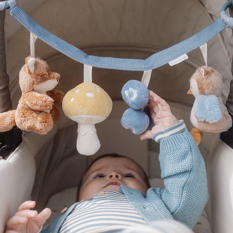 Rammel, piep, knisper. Ontdek de vier schattige speeltjes uit de Forest Friends collectie aan deze wagenspanner. Het lieve vosje, schattige uil, paddenstoel en takje blauwe bessen kunnen niet wachten om je te vermaken tijdens een wandeling. Geef je kindje een zintuiglijke ervaring met deze kleurrijke wagenspanner, die de ontwikkeling van de hand-oogcoördinatie stimuleert terwijl jullie onderweg zijn. Bevestig de wagenspanner eenvoudig aan een kinderwagen. WAARSCHUWING: Om te voorkomen dat het kind verstrikt raakt, en zich bezeert, verwijder dit speelgoed wanneer het kind op handen en voeten begint te kruipen. Te monteren door een volwassene.