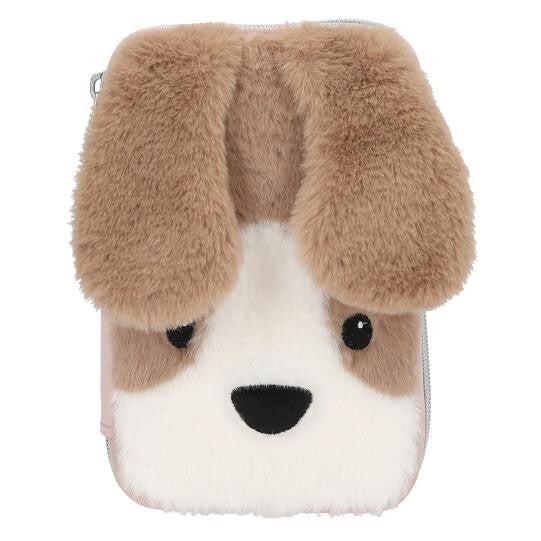 Woef, wow! De super schattige, pluizige etui heeft op de voorkant van pluche een gezichtje van een bruin-witte hond met lange flaporen. De ogen en de neus zijn geborduurd. De achterkant van de flaporen en de stoffen hanger aan de rits hebben een schattige bloemenprint. De twee aparte vakken zijn gevuld met 12 dikke kleurpotloden, 2 glitter gelpennen, een dik potlood, een dubbele puntenslijper, een gum, een liniaal met sjabloon, een schaar en een plakstift. Van Princess Mimi. Materiaal 100 procent polyamide, voorkant en voering 100 procent PES.