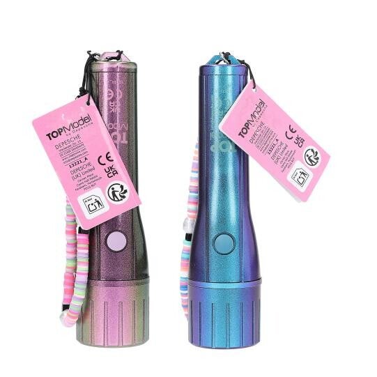 Shinen met stijl: de twee TOPModel zaklantaarns hebben elegante kleuren. Ze zijn verkrijgbaar in blauw of in groen-roze. Met opvallende handlus in qua kleur bijpassende kralen. Handig: de zaklantaarn heeft een switch off functie en gaat automatisch na 10 minuten weer uit. Batterijen (2x AA) ingesloten.