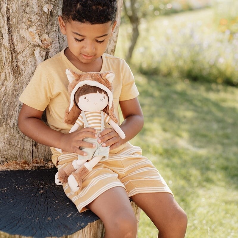 Maak kennis met Forest Friend Sam, een zachte pluche pop in een schattige vossenoutfit. Samen met het vosje neemt Sam je mee op avontuur in het bos, waar ze met hun dierenvriendjes allerlei bosschatten verzamelen, zoals paddenstoelen, eikels en dennenappels. Sam is knuffelbaar en perfect voor kleine handjes. Zijn lieve gezichtje en gedetailleerde outfit maken hem een fijne speelmaatje en een mooie decoratie voor de kinderkamer. Beleef de leukste avonturen in het bos met Forest Friend Sam!