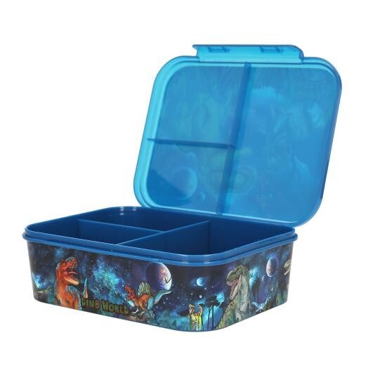 Galaxy cool: de blauwe broodtrommel van Dino World heeft op de deksel en op de zijkanten afbeeldingen van dino's voor een spacey achtergrond. Met klikdeksel en een verdeling in 3 aparte vakken. Vanwege de drukke print niet geschikt voor de vaatwasser en de magnetron. Materiaal: ethyleen polypropyleen, copolymeer; bevat geen bisfenol A (BPA) en geen weekmakers (ftalaten).