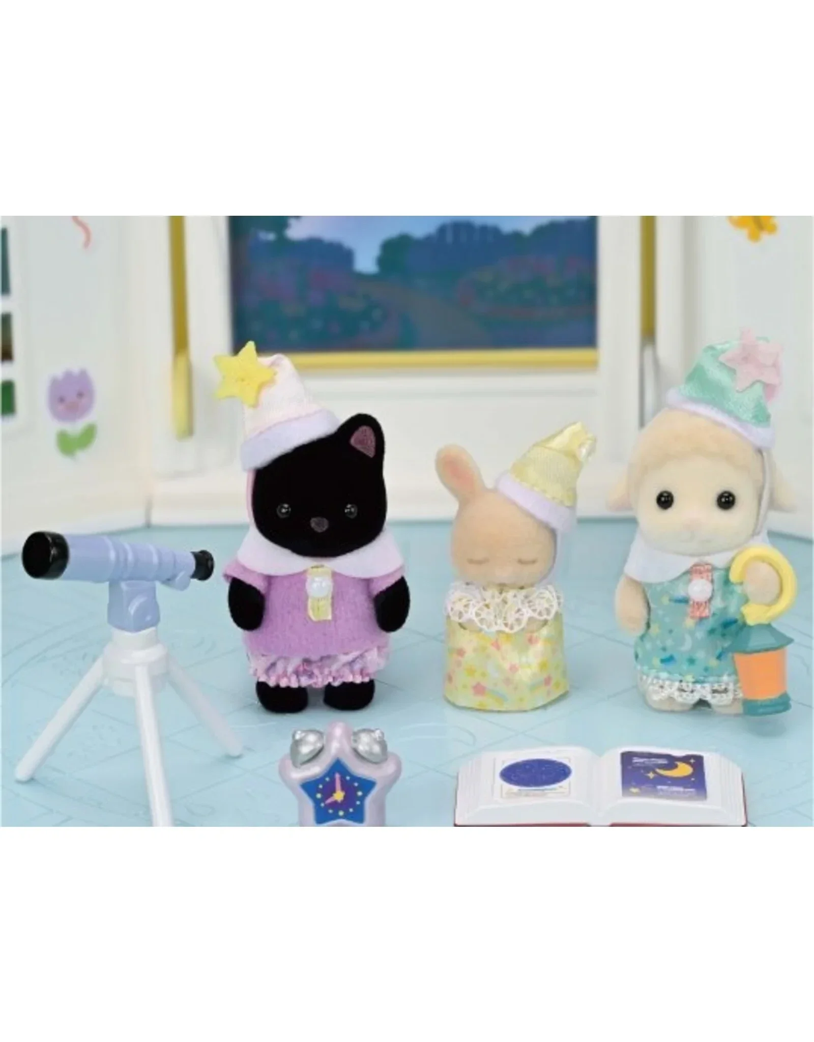 De Sylvanian Families baby's zijn allemaal gekleed in de nieuwe schattige pyjama met schattige sterpatronen, klaar om naar de sterren te zoeken! Hun lantaarn is ook het perfecte accessoire om de weg te vinden door de donkere nachten, samen met hun telescoop en sterrenbeeldboek. Adviesleeftijd 3+