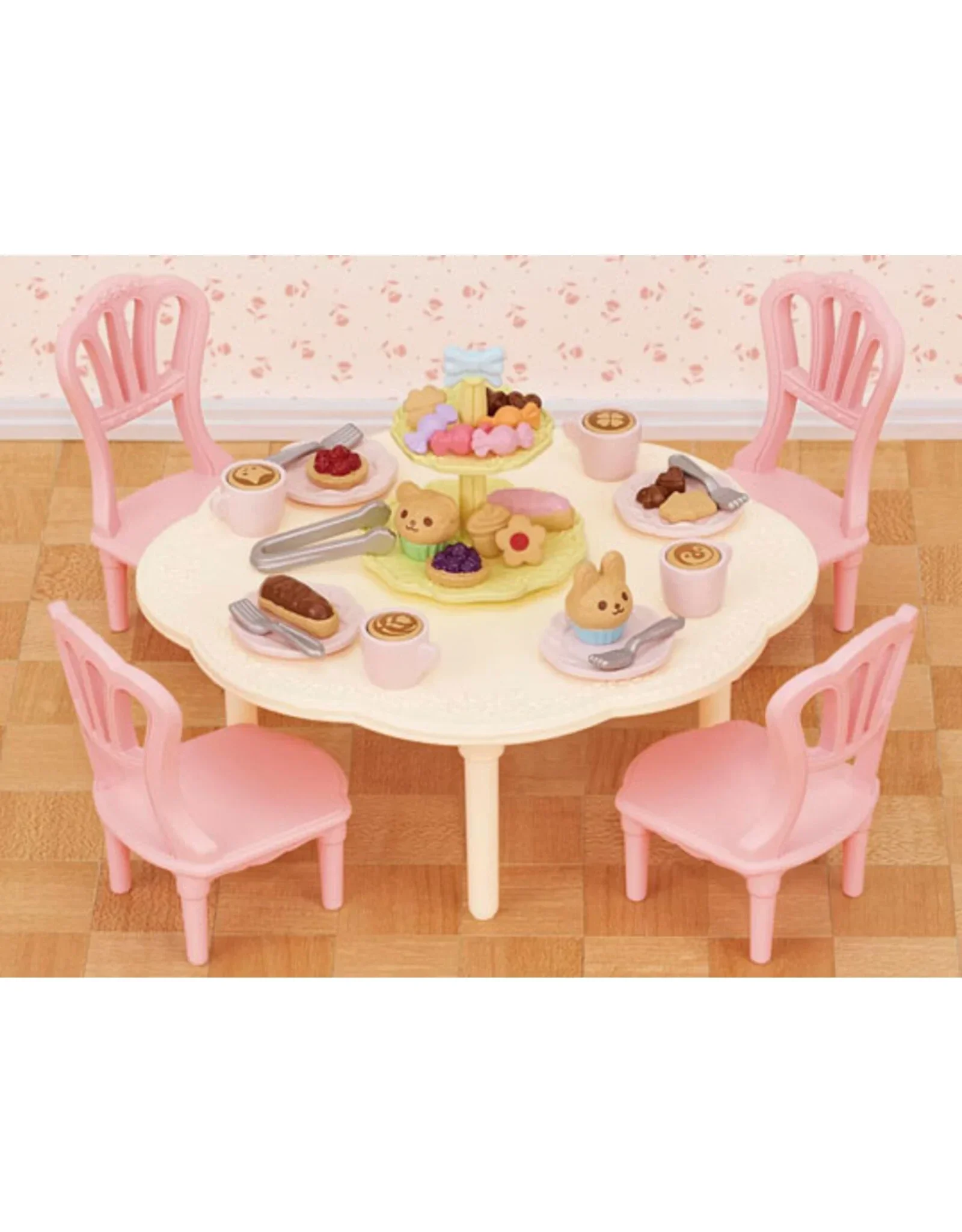 Jouw Sylvanian Families zullen in de rij staan om uitgenodigd te worden voor dit feest. De grote tafel en vier stoelen voor uw gasten maken dit de perfecte feestset voor elke speciale gelegenheid.