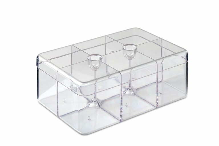 Rechthoekige theedoos van Mepal. In deze praktische vorm presenteert en serveert u uw theezakjes op een elegante manier. Door de vorm van de doos, die is onderverdeeld in 6 vakjes die elk ruimte bieden aan ongeveer 10 theezakjes, kunt u zelfs het laatste zakje makkelijk pakken!