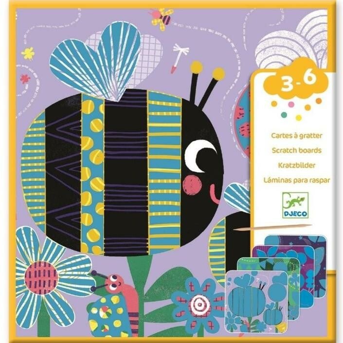 Ontdek vele verrassingen met de kraskaarten "Allemaal beestjes" van het Franse merk DJECO. Kras met de bijgeleverde kraspen over de kaarten en maak mooie motieven of ontdek de grappigste beestjes. De set bestaat uit 4 kaarten met afbeeldingen van beestjes en een houten kraspen.