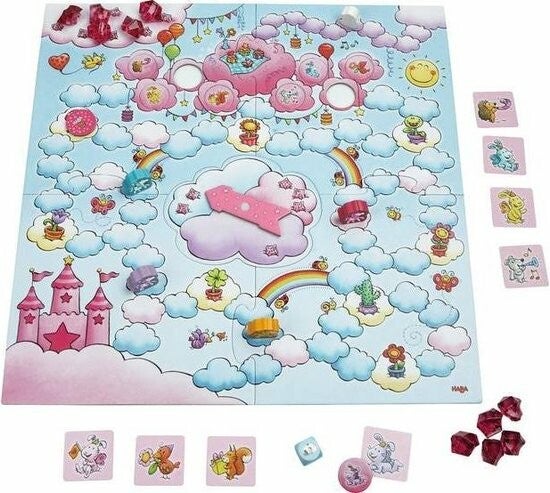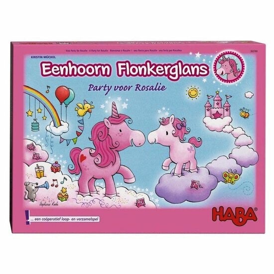 Joepie, er komt een nieuwe bewoner naar wolkenland! De eenhoorns Flonkerglans, Sterrenstof, Wonderbloem en Toverhart willen het eenhoornkind Rosalie een prachtige ontvangst bieden en bereiden een geweldig welkomstfeest voor. Help de eenhoorns: vind alle vrienden en verzamel samen de grote wolkenkristallen. Maar haast jullie! Alles moet klaar zijn voor Rosalie op de partywolk aankomt. Vanaf 3 jaar, voor 2 tot 4 spelers, speelduur ca. 15 minuten.