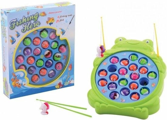 Zullen de vissen vandaag willen bijten? Dat is de grote vraag in het Fishing Hero Hengelspel! Het plateau draait in het rond en de kleurrijke vissen openen af en toe hun mond om toe te happen. Kan jij dan met behulp van de hengel zo veel mogelijk vissen vangen? Ben je snel genoeg? Het blauwe plateau heeft een diameter van 21 centimeter. Door het grote formaat is dit visspel gemakkelijk met vier spelers tegelijk te spelen. Het spel bevat 21 vissen, 4 hengels en speelt een vrolijk liedje. De aan/uit schakelaar is eenvoudig door kinderen zelf te bedienen. Werkt op 2x AA batterijen (niet meegeleverd).