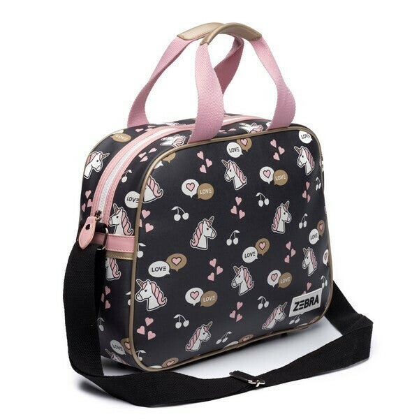 Deze kidsbag is perfect voor een logeerpartij! De zwarte tas is versierd met een print van hartjes, kersjes en unicorns. Afgewerkt met roze handvaten, een lange schouderband en gouden details. De tas sluit met een blokrits met dubbele sluiting. Binnenin zijn er 2 drinkbeker vakken en de tas heeft een harde bodem.