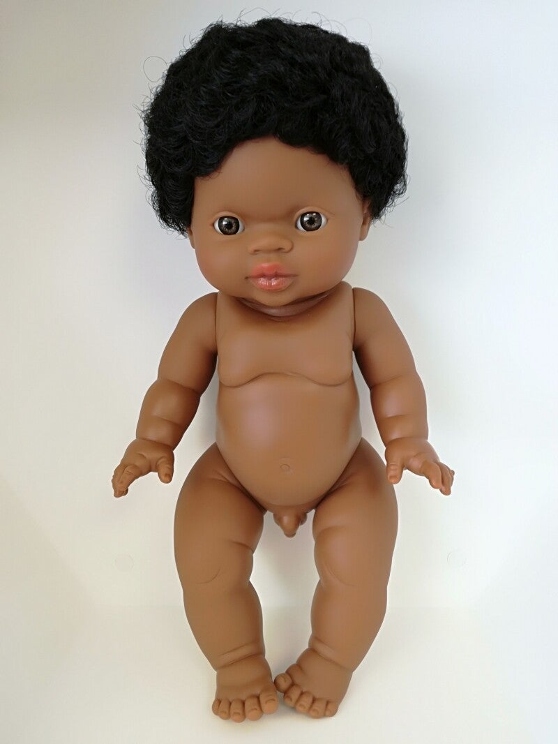 Kleur: donkere jongen met kort krullend haar en bruine ogen