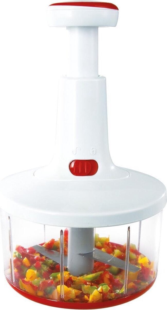 Deze mechanische keukenhulp Twist Cut van Leifheit is een echte innovatie: hij werkt net zo effectief als een elektrische keukenmachine en tegelijk zo simpel als een bromtol. De extrascherpe messen snijden in slechts enkele seconden groente, fruit en kruiden – van grof tot fijn, wat je wilt. De hulpstukken zijn gemakkelijk verwisselbaar. Met de garde maak je van de Twist Cut een praktische mixer. Daarmee is slagroom kloppen of een lekkere sla dressing roeren een koud kunstje. Helemaal zonder stroomverbruik – in tegenstelling tot gewone keukenmachines. Met de grote beker van een liter kun je zelfs hele gerechten bereiden, zoals bijvoorbeeld salades, dipsauzen, smeersels voor op brood, desserts, ijs en ook babyvoeding. In het bijgevoegde receptenboekje vind je lekkere recepten en ideeën. Afsluitbaar met deksel – bijzonder handig. Geen overhevelen in een andere bewaarkom – gerechten of restjes kunnen zo in de koelkast. Het aandrijfdeel van de Twist Cut kan van de deksel afgenomen worden. Zo kun je de deksel gemakkelijk schoonmaken, ook in de vaatwasser.