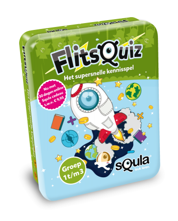 Flitsquiz voor groep 1,2 en 3! Test je kennis in dit flitsende kaartspel! Geef jij als snelste het juiste antwoord? Het spel bestaat uit meer dan 100 uitdagende vragen over verschillende basisschoolvakken. Draai een kaart open op tafel en bedenk het goede antwoord. Weet jij het juiste antwoord? Wees dan snel, voor je het weet is iemand je voor! Degene met de meeste punten wint. Soeel snel en slim. Klaar voor de start?... Flits! Veel speelplezier!