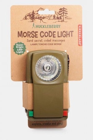 Een zaklamp om morsecode signalen mee te verzenden. De zaklamp heeft een stoere retro look door zijn groene metalen behuizing. De lamp heeft een rood en groen filter, naast gewoon wit licht.